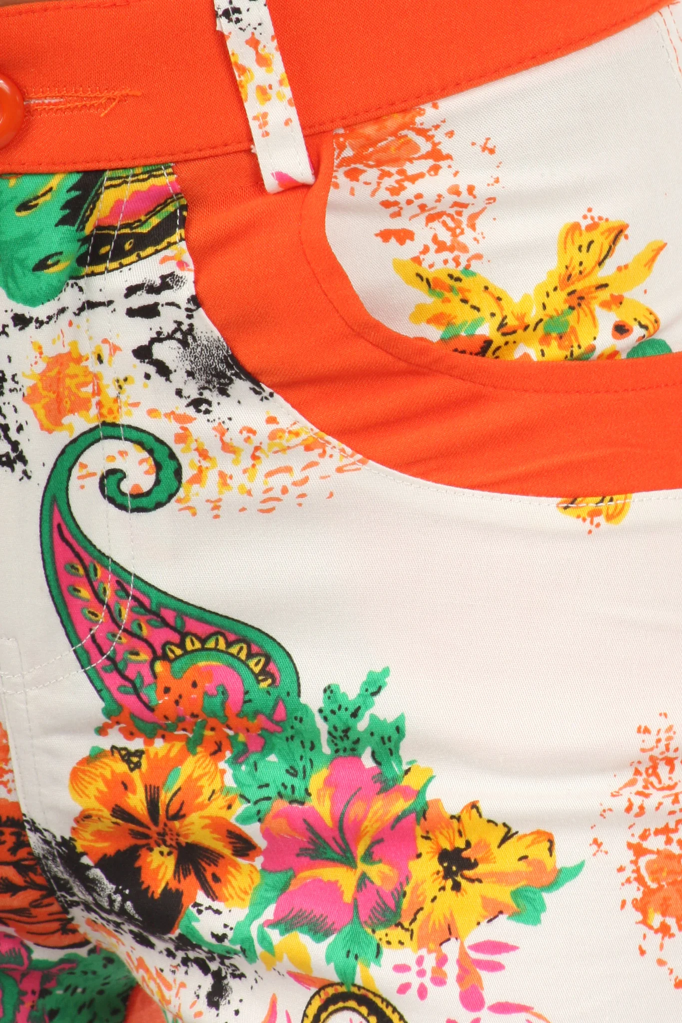 Groovin n' Bloomin. Perfect paisley floral motif against a fun mandarin orange backdrop. 4 pocket construction for all your essentials. Cotton blend is breathable, yet contours to your body. Wear with a large belt buckle and booties to give it a little edge.