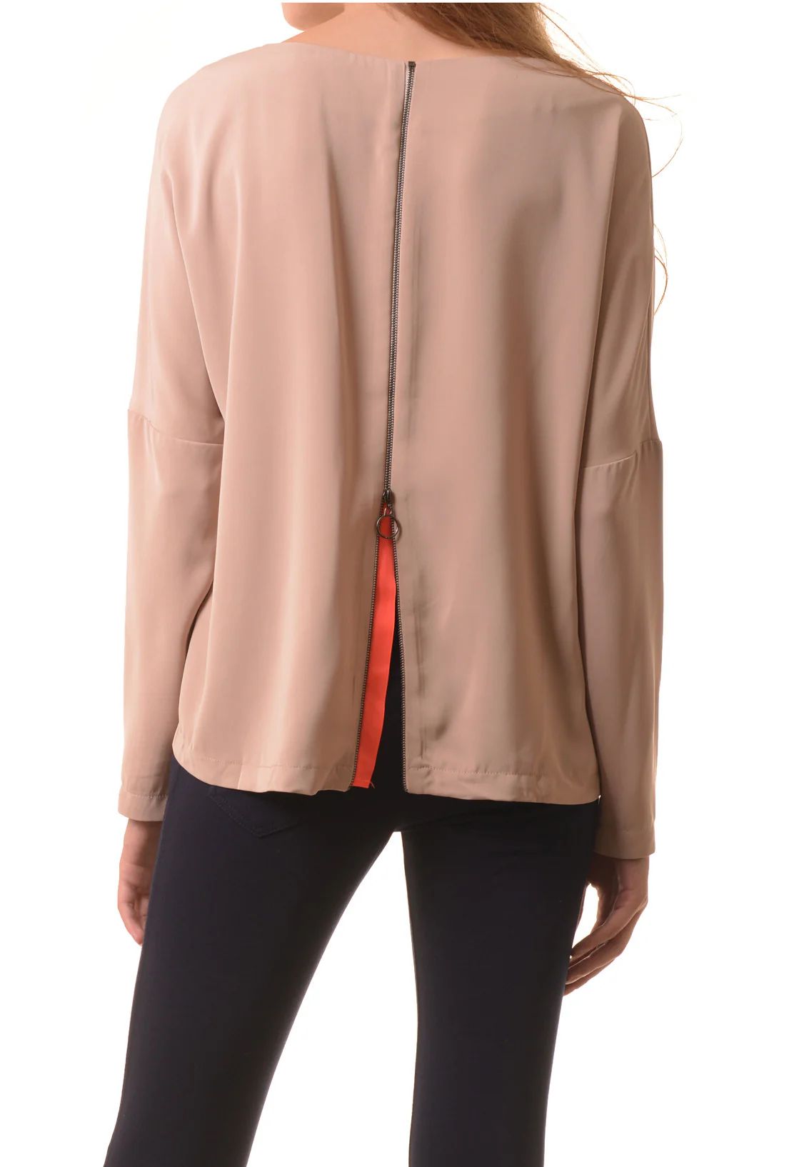 We're blushing all the way home knowing we have a sweet blouse like this hanging in our closet. Functional back zipper detail with neon contrast trim adds some edge to this perfect work blouse. Dropped shoulder construction adds nice drape to the flowy silhouette. Pair with neutral leggings and tall boots for a transitional day to night look.