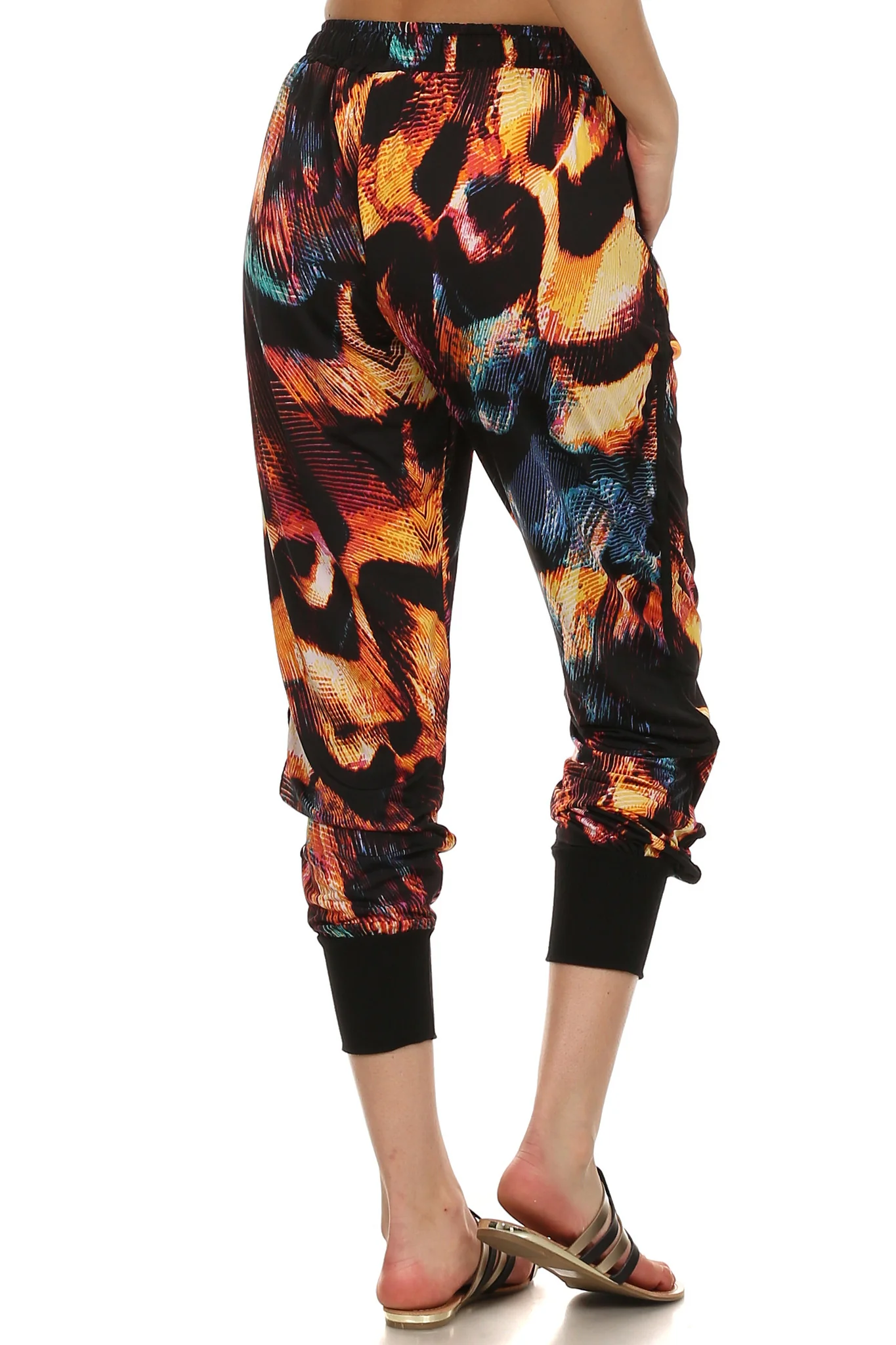 Set your style on fire with these abstract flame printed jogger pants! Gold hardware embellishes the two front functional pockets and the elastic drawstring waistband provides extra comfort. Finished with an athletic side stripe and ribbed cuffs.