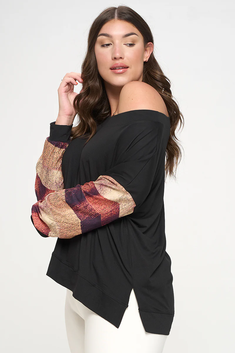 Show off those sexy shoulders in this long sleeve top! Featuring soft, stretchy knit fabric contrasted with a woven knit print design printed down both sleeves, and a wide, scoop neckline that can be worn straight or off the shoulder for some extra sass. Perfect to pair with some jeggings or leggings and some high knee boots.