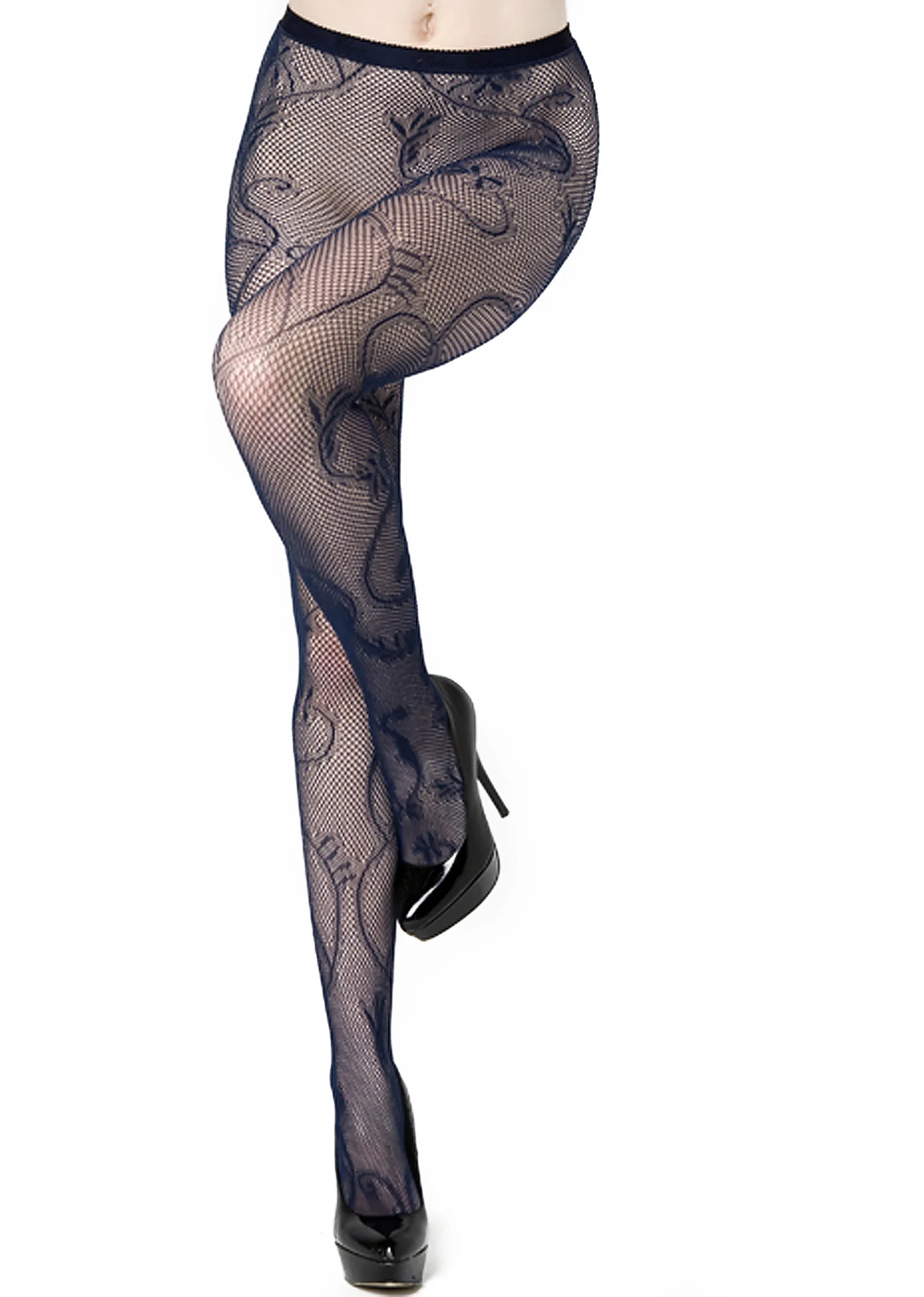 Floral stitching wraps around the leg of these colored fishnet pantyhose from elastic waistband to toe. Available in regular and plus size. Reinforced toe and cotton gusset for additional support. Pick your favorite style to keep warm and stylish all Winter long!