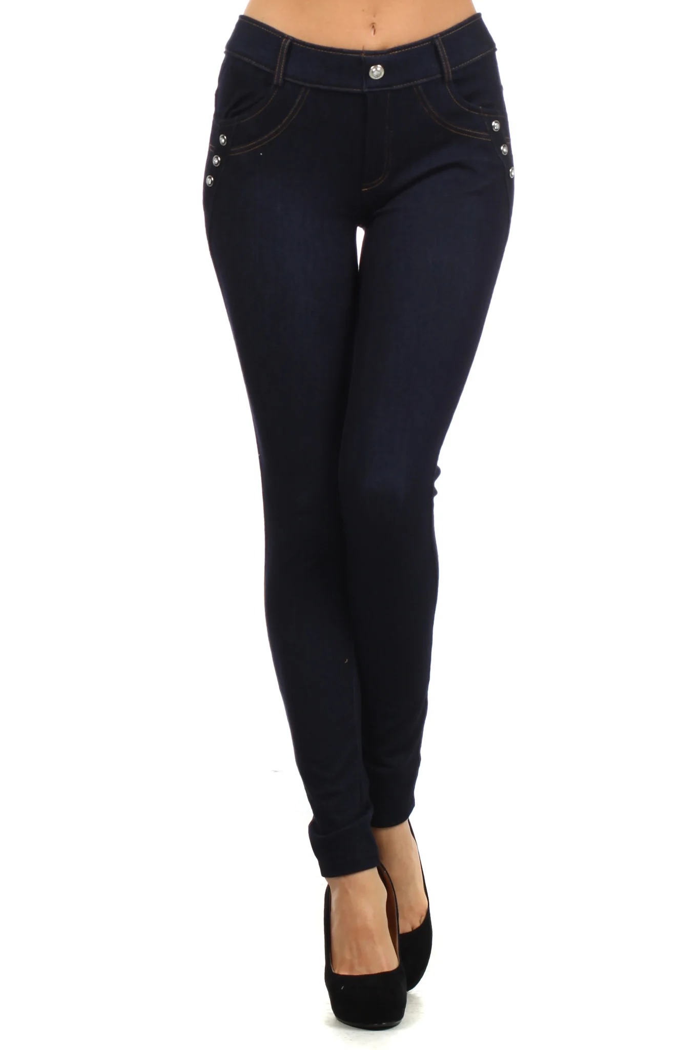 Our favorite go-to on those lazy mornings. Why sacrifice the comfort of a legging when you don't have to? Subtle rhinestone detail slanted on the front pockets gives em' a little flash. Natural rise provides light control for all day wear. Polyester blend contours the hips for hourglass silhouette. Wear with everything from sneakers to sky high pumps.
